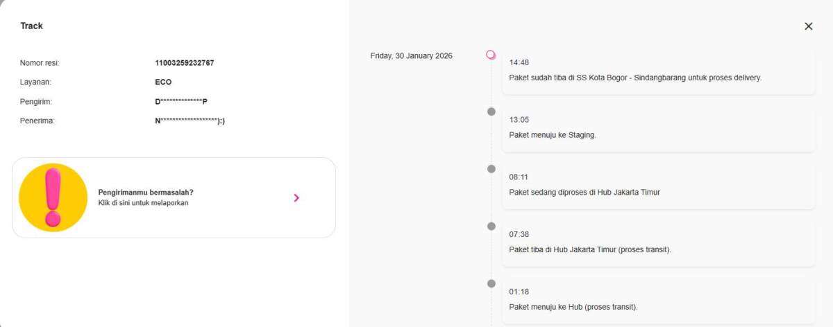 Ketika saya melacak pesanan saya di website AnterAja, paket tersebut sudah tiba di kota tujuan pada tanggal 30 Januari 2026 (14:48 Paket sudah tiba di SS Kota Bogor – Sindangbarang untuk proses delivery). Saya sudah mendatangi langsung ke ekspedisi AnterAja Sindangbarang 3 kali pada tanggal 2, 4, dan 5 Februari 2026, tapi paket saya juga tidak ada di sana.