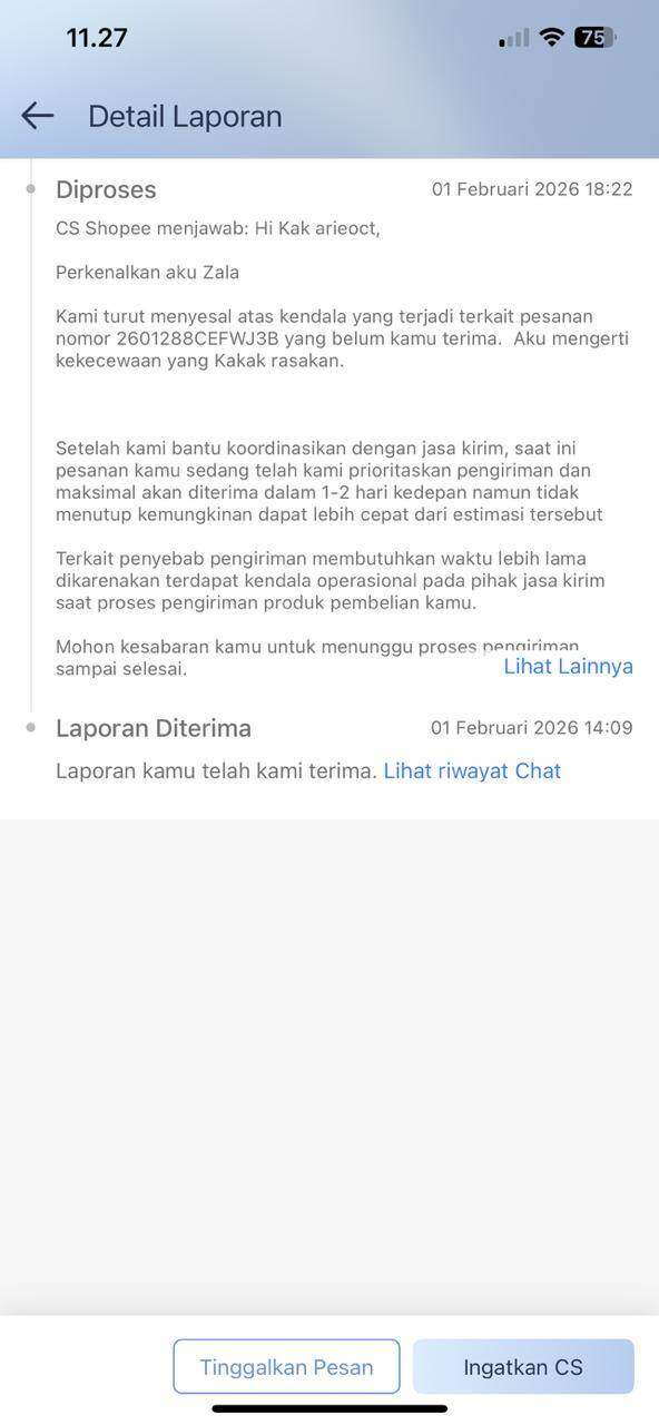 Padahal pada tanggal 1 Februari 2026, CS Shopee ini memberikan pernyataan bahwa pengiriman akan diprioritaskan maksimal 1 – 2 hari, tapi kenapa pada tanggal 3 tidak sesuai dengan informasi yang disampaikan sebelumnya?