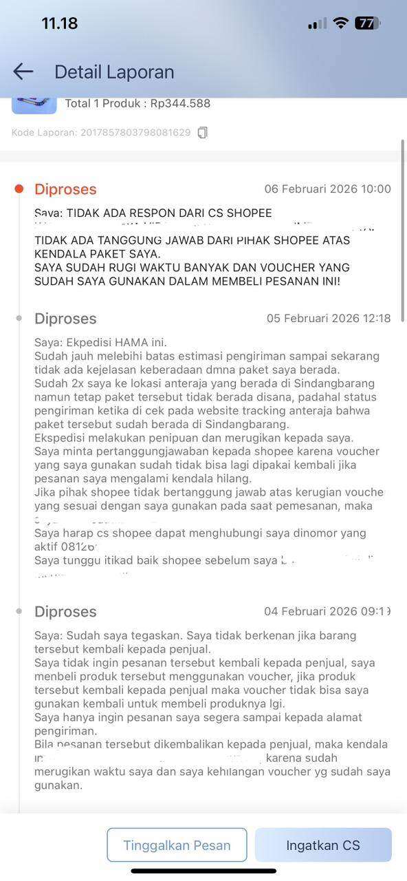 Kemudian pada tanggal 4, 5, dan 6 Februari 2026, saya menghubungi CS Shopee, tapi tidak ada respon sama sekali. Apakah Shopee sudah lepas tanggung jawab atas kendala yang saya alami? Sudah berhari-hari tidak ada kejelasan mengenai keberadaan paket saya.