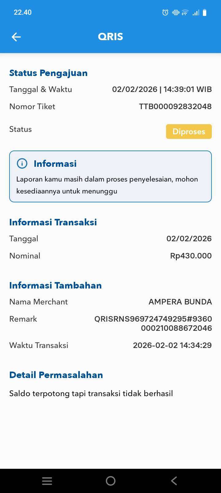 Pada hari Senin, tanggal 02 Februari 2026, sekira pukul 14.00 WIB, saya melakukan pembayaran QRIS menggunakan aplikasi BRImo, namun keluar keterangan “transaksi terputus“.