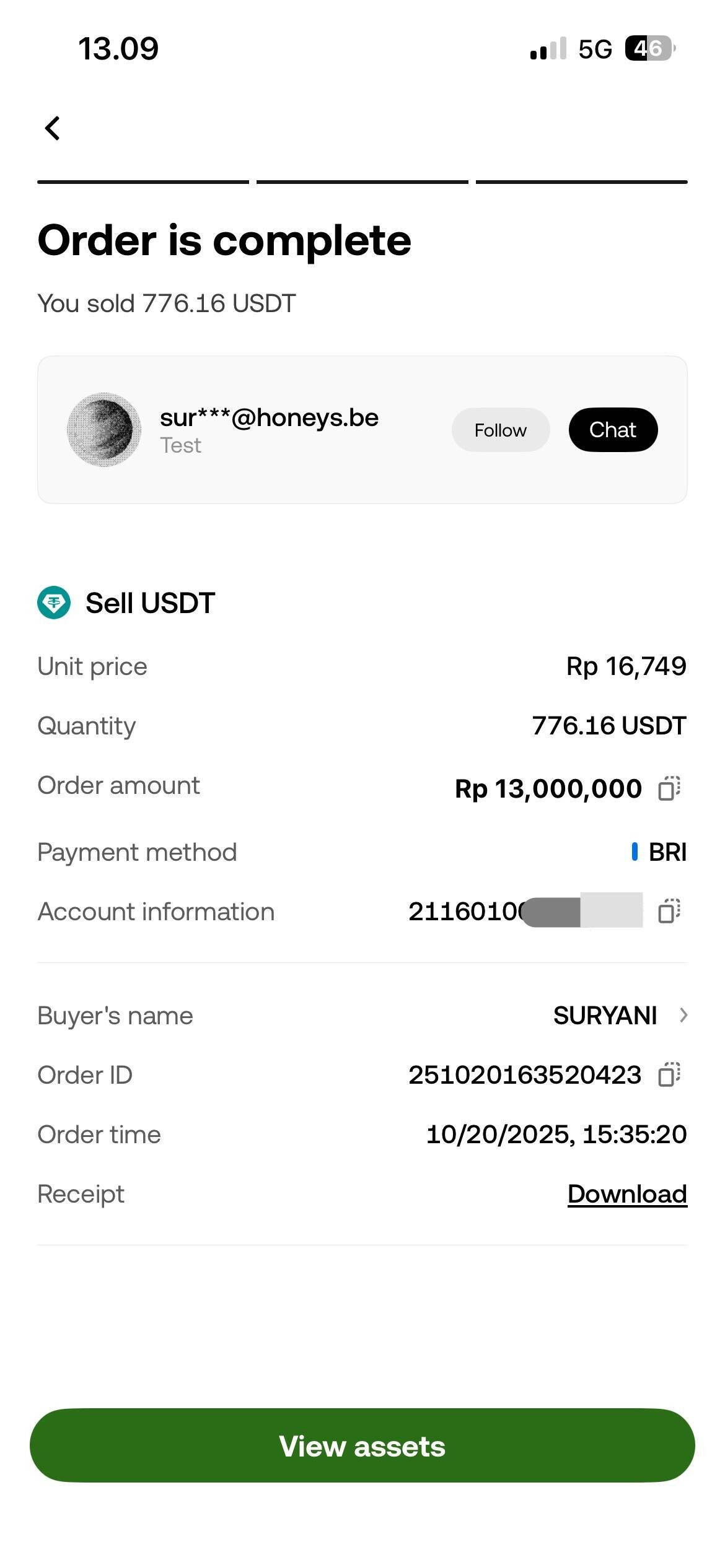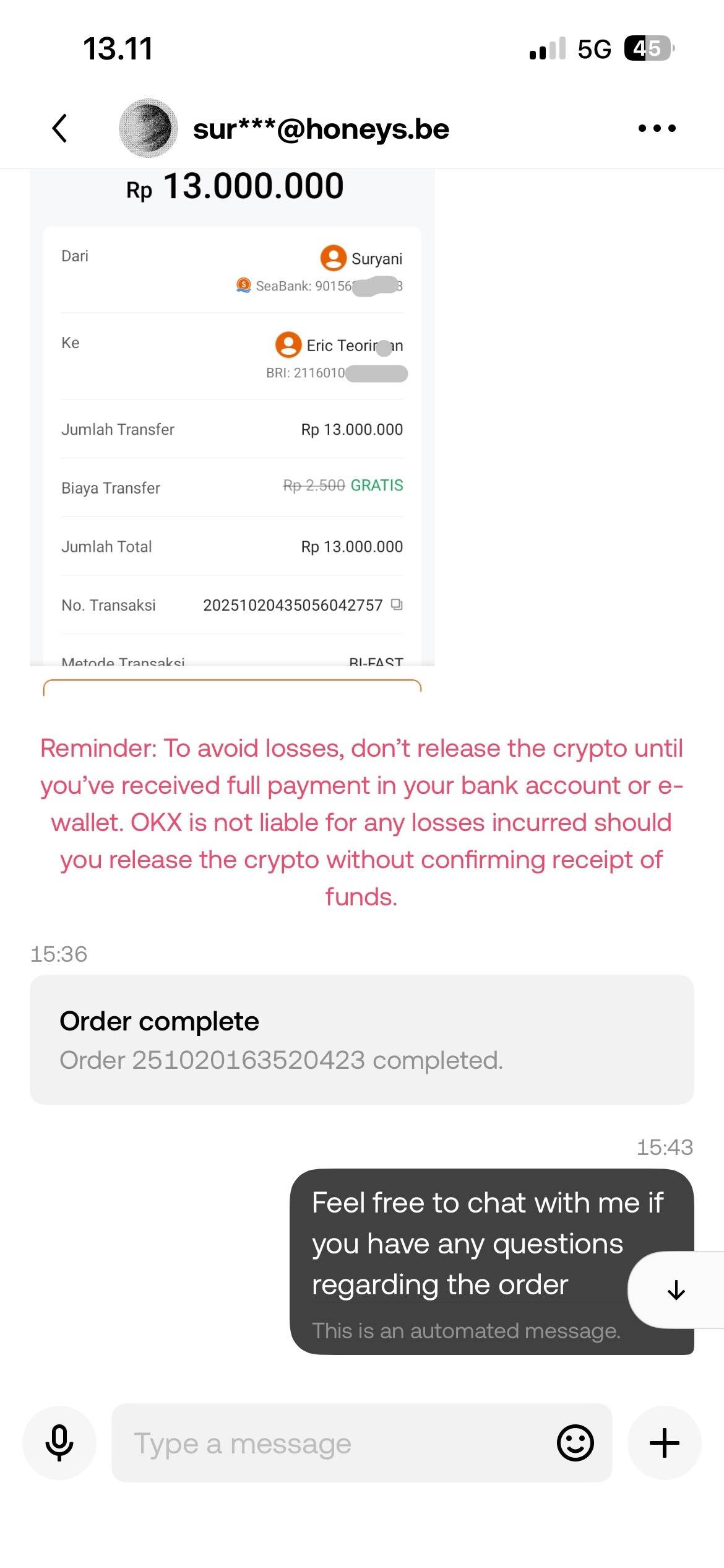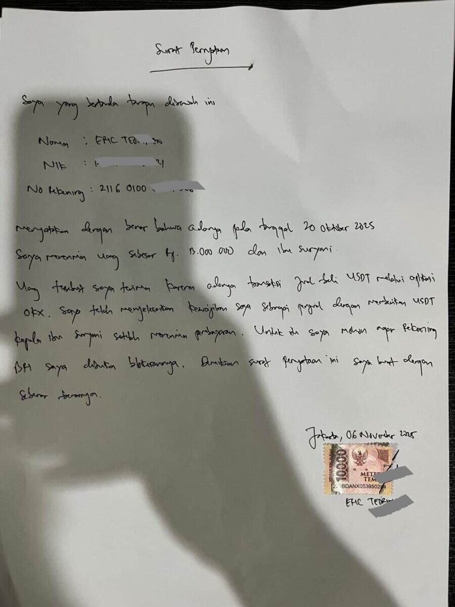 Transaksi yang dipermasalahkan adalah jual beli USDT. Saya tidak mengenal pihak pembeli secara pribadi; ia membeli USDT melalui aplikasi dan transaksi dilakukan secara online, sebagaimana sudah saya jelaskan dalam surat pernyataan kepada BRI.