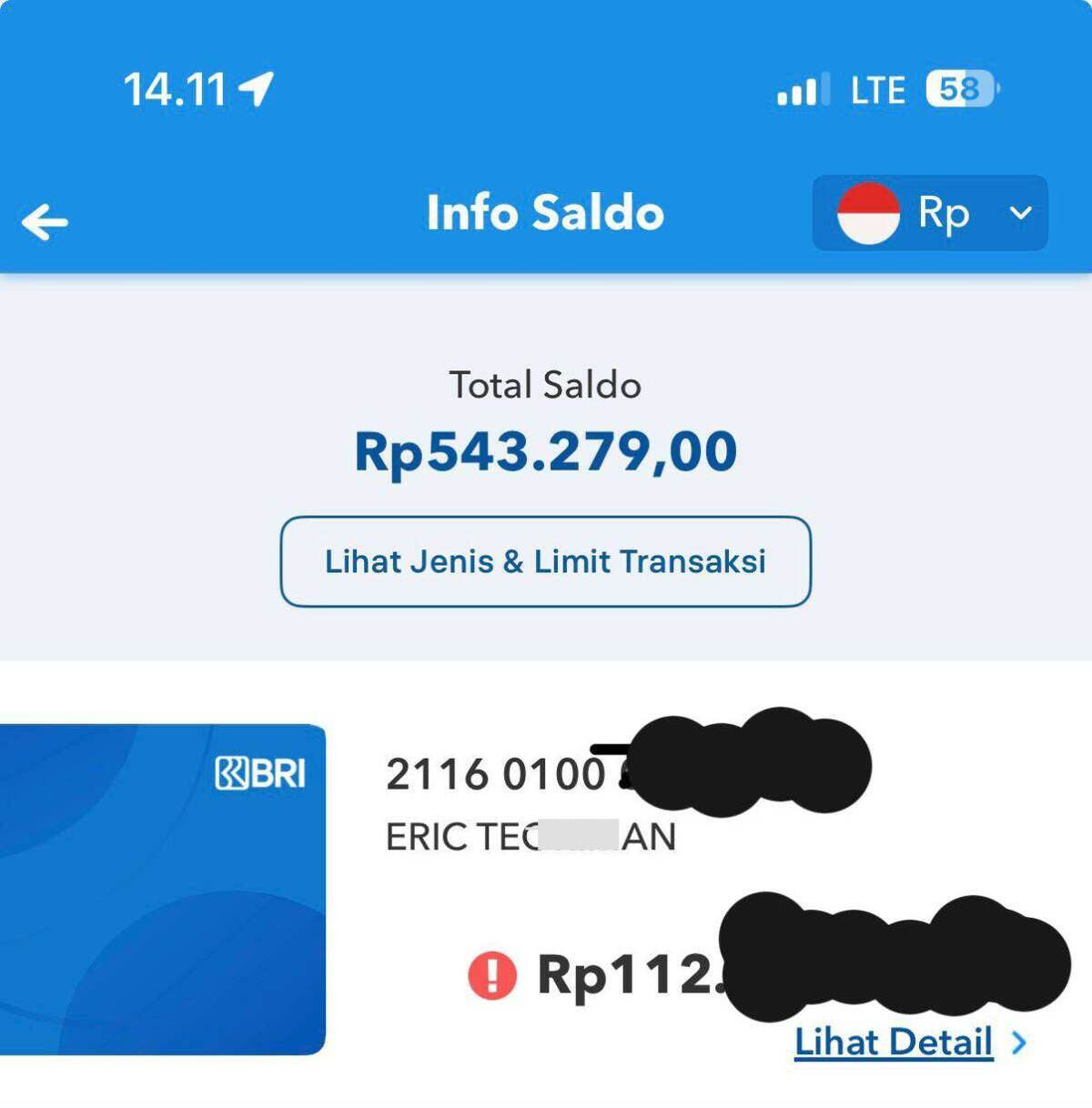 Detail dana yang terblokir di rekening BRI 211601000947*** : Rp112.***.***