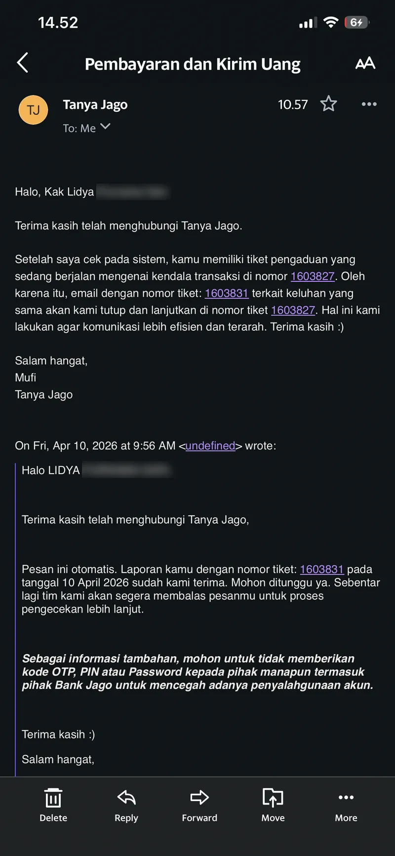 Tidak lupa saya hubungi CS WhatsApp resmi Bank Jago, dan hanya dijawab sedang penanganan hingga waktu yang belum bisa ditentukan.