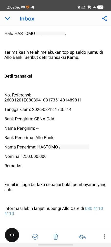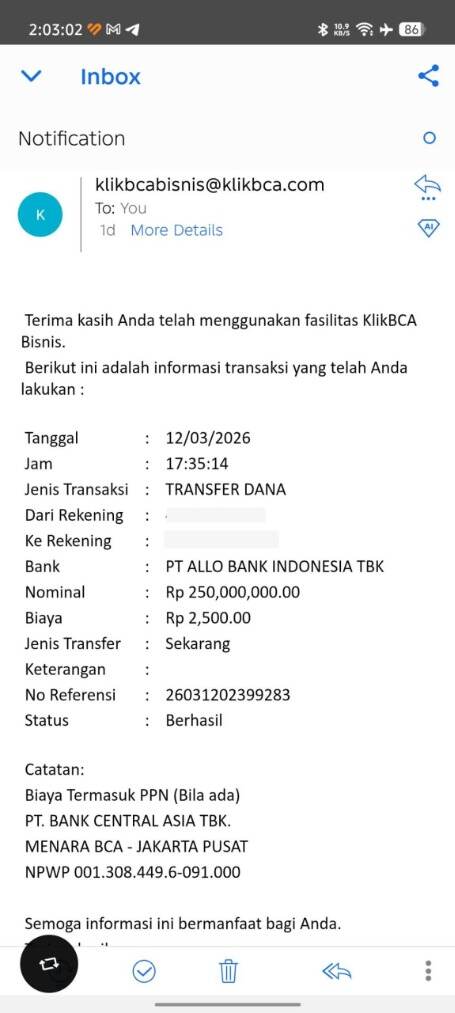 Pada tanggal 12 Maret 2026, saya melakukan transfer sejumlah uang dari rekening BCA yang terdaftar atas nama saya sendiri ke Allo Bank, yang juga atas nama saya, dengan nominal sebesar dua ratus lima puluh juta rupiah. Namun, alih-alih mendapatkan akses ke dana tersebut, rekening saya justru diblokir secara instan oleh pihak Allo Bank.