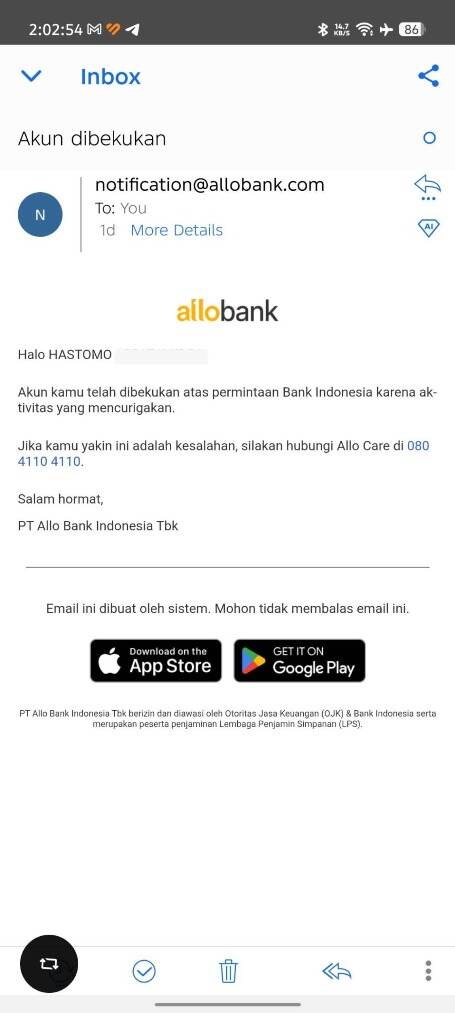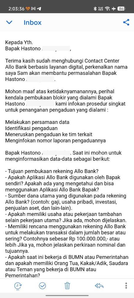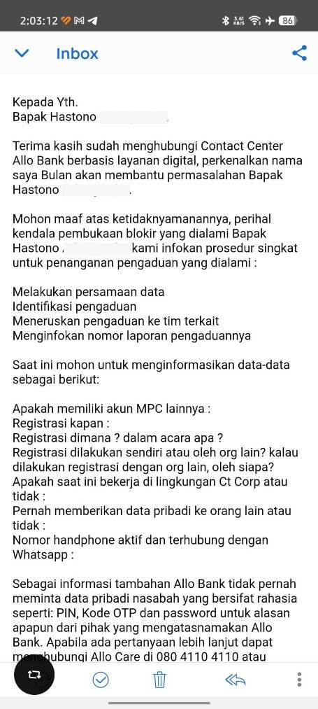 Saya sangat heran dan kecewa karena tanggapan dari pihak Allo Bank terdengar seperti jawaban otomatis dari robot yang tidak memberikan kepastian atau klarifikasi yang jelas atas masalah ini.