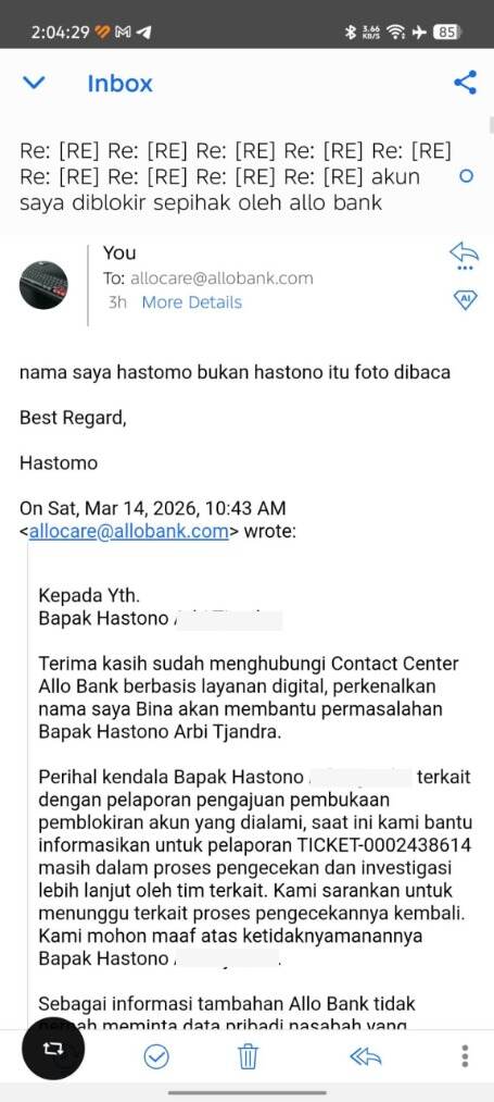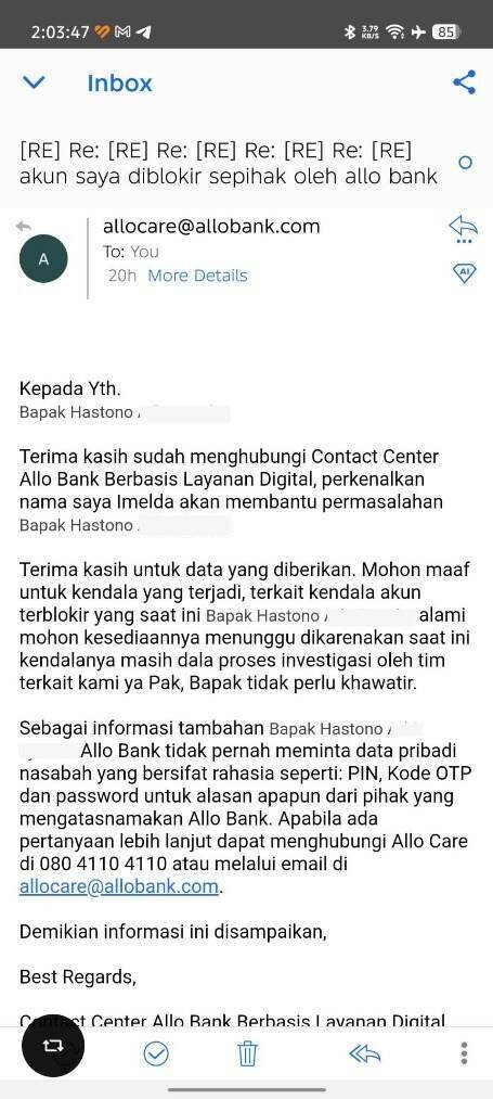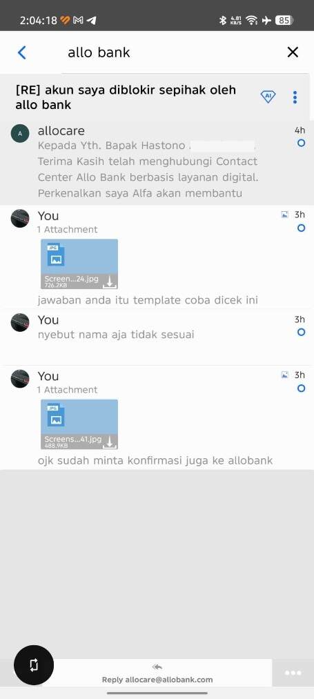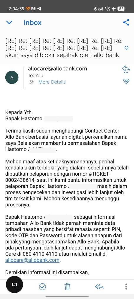 Rasanya tidak adil dan memalukan ketika harus merepotkan diri sendiri hanya untuk menarik uang dari rekening yang secara sah merupakan milik pribadi saya, tetapi malah mendapatkan halangan seperti ini. Saya bahkan telah berusaha menelpon dan mengirim email ke Customer Service Allo Bank berkali-kali selama lebih dari 12 jam, yang jelas-jelas sangat merugikan karena kebutuhan akan uang tersebut mendesak.