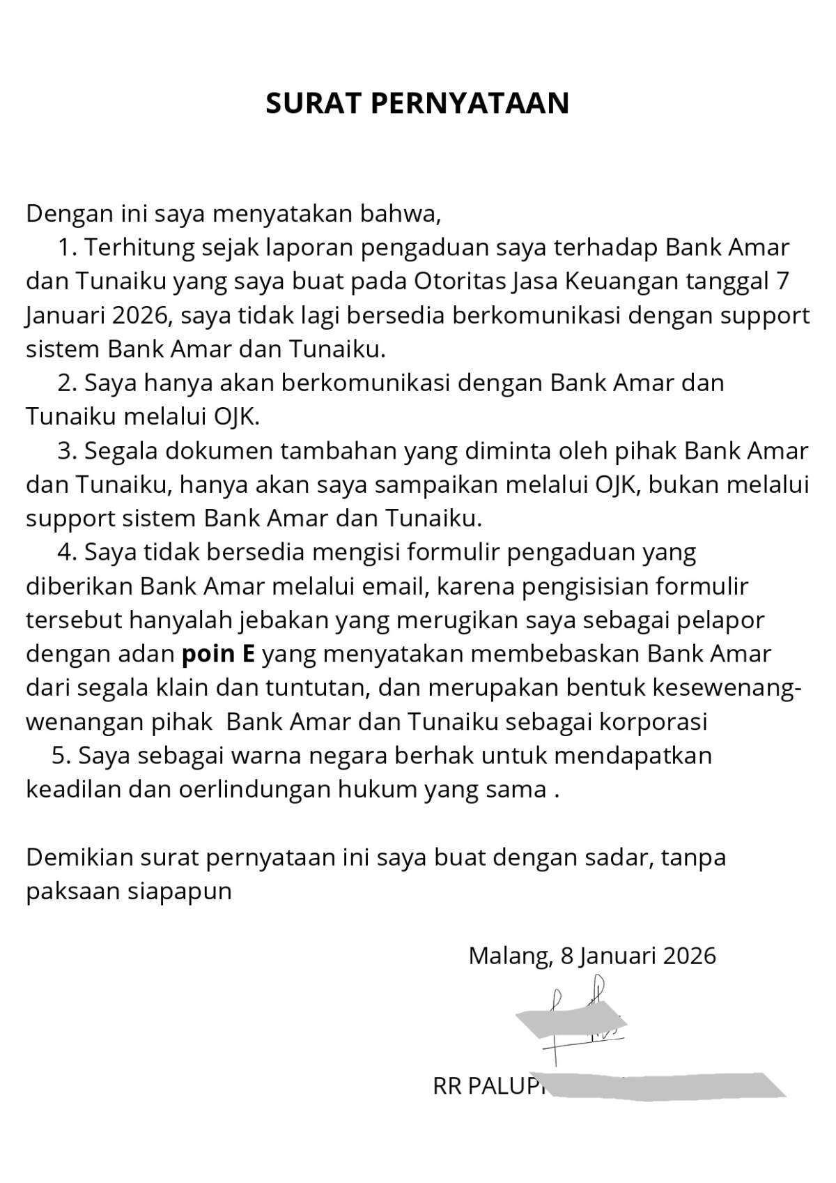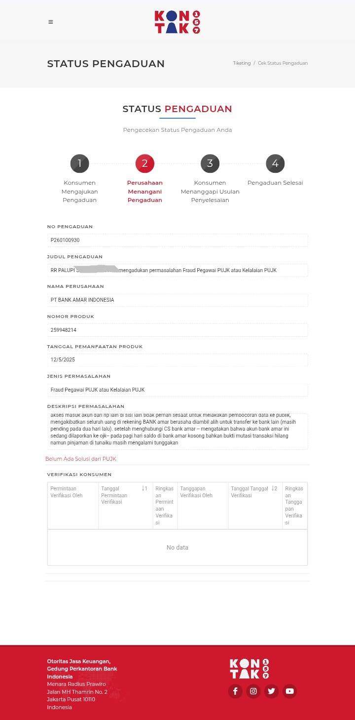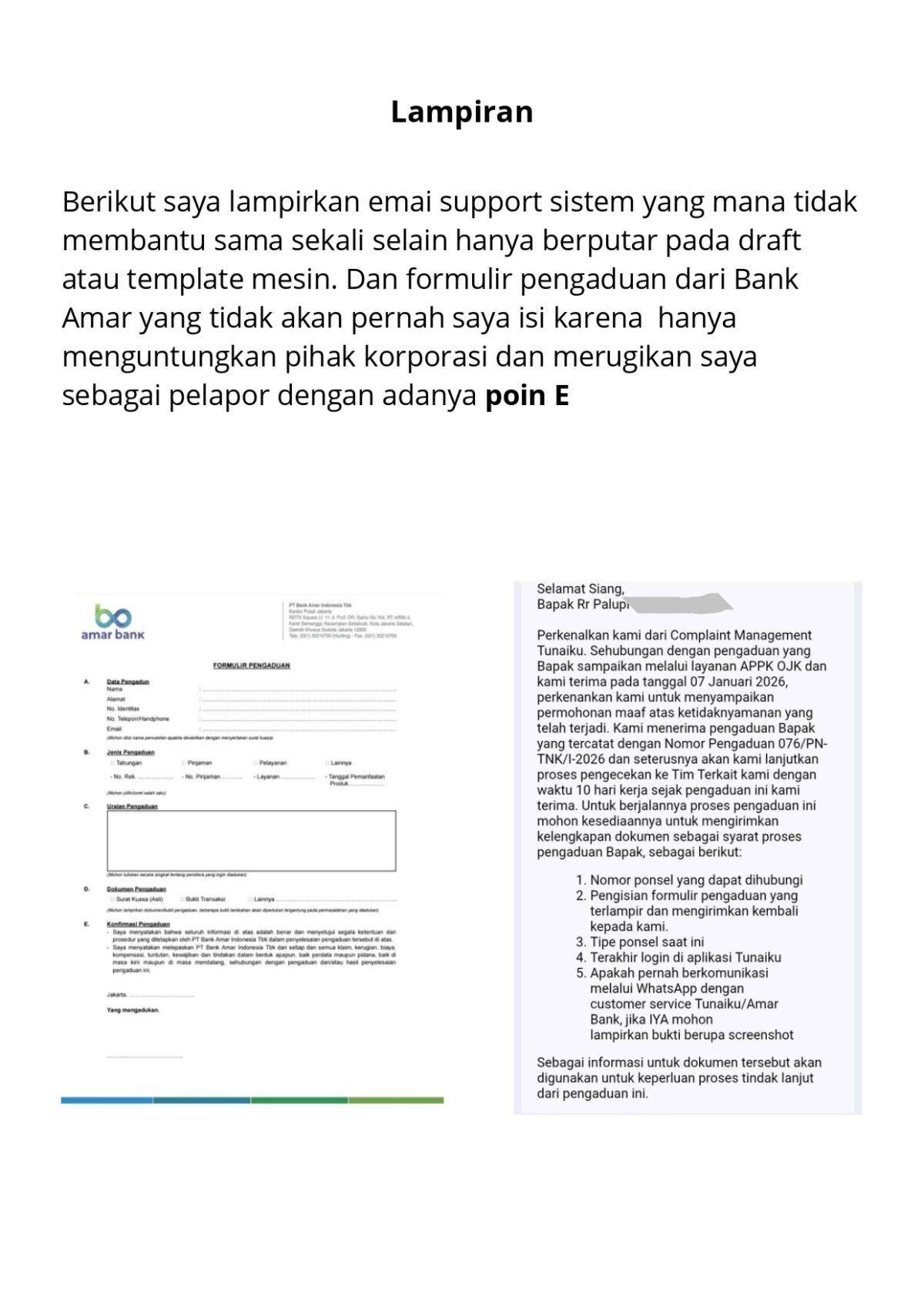 Di lain pihak, customer care mengirim email yang meminta saya mengisi formulir pengaduan. Anehnya, dalam formulir tersebut terdapat poin E yang menyatakan bahwa saya menerima Bank Amar dibebaskan dari segala klaim dan tuntutan perdata maupun pidana serta kerugian apa pun atas masalah yang terjadi. Poin tersebut jelas merupakan jebakan yang merugikan saya sebagai pelapor dan pihak yang dirugikan. Tentu saya tidak bersedia mengisi formulir tersebut dan menyatakan bahwa saya hanya akan melakukan mediasi dengan Tunaiku Bank Amar melalui portal OJK. Sampai hari ini, tagihan tidak berhenti dan permasalahan masih dalam proses.
