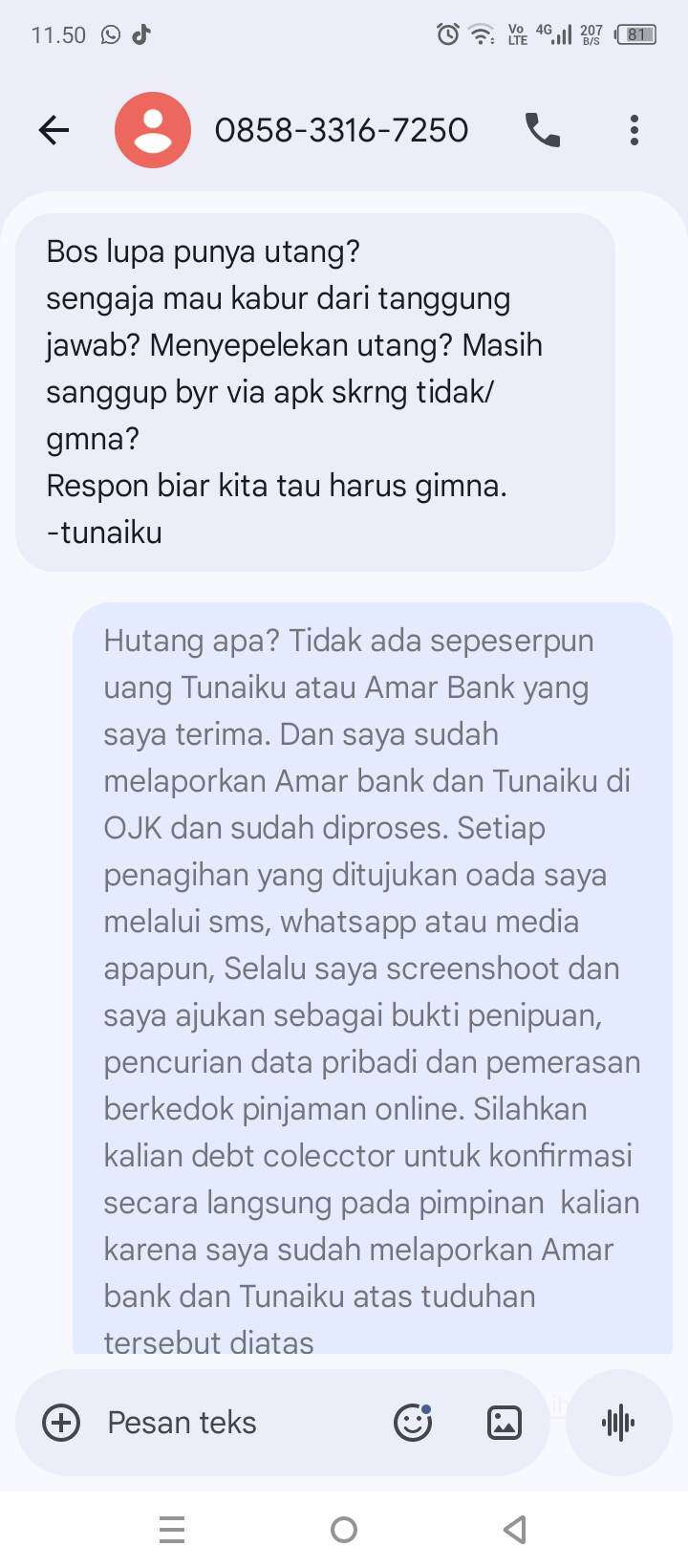 Pada tanggal 7 Januari 2026, saya mendatangi kantor OJK Kota Malang dan melaporkan Bank Amar dan Tunaiku dengan nomor laporan P260100930 dan saat ini sudah dalam tahap investigasi. Namun, saya terus menerima pesan penagihan secara masif melalui SMS dan WhatsApp dari nomor yang terus berganti-ganti.