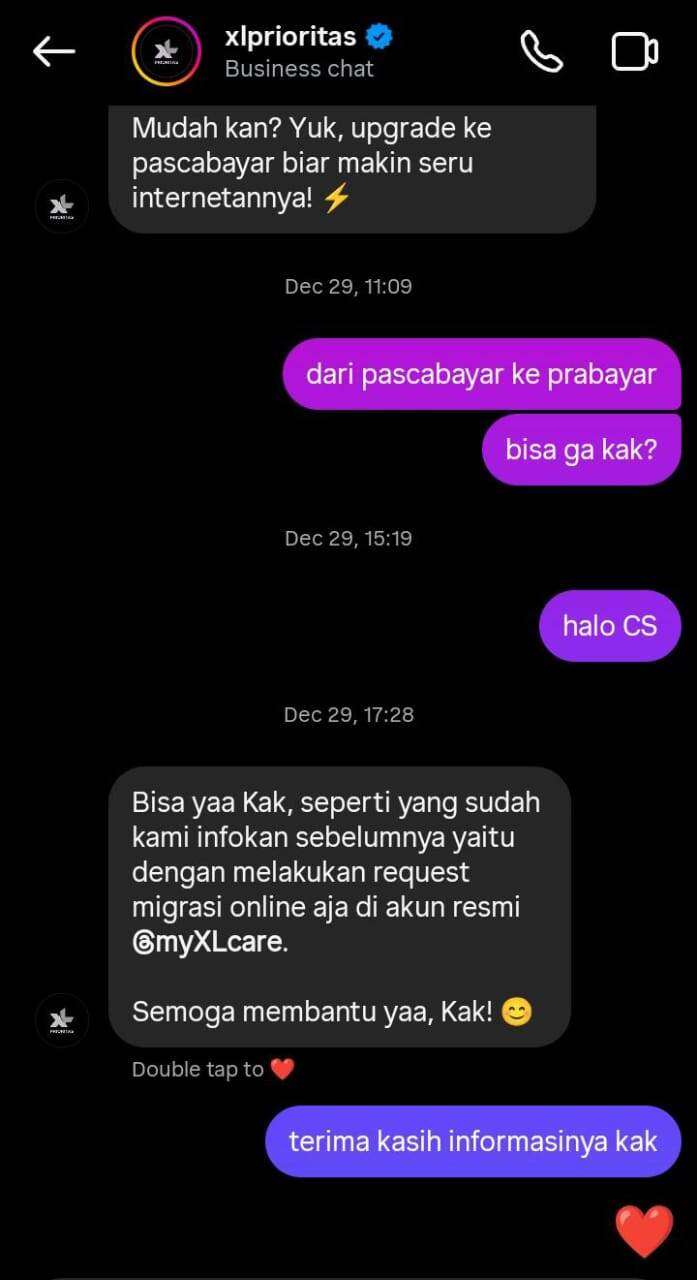 CS XL Prioritas di Instagram dan Facebook menginformasikan bahwa XL pascabayar dapat berpindah ke XL prabayar. Namun, XL Center dan Call Center XL memberi tahu saya tidak bisa migrasi, sehingga saya merasa bingung mana yang benar? Kenapa kebijakannya bisa berbeda-beda seperti ini?
