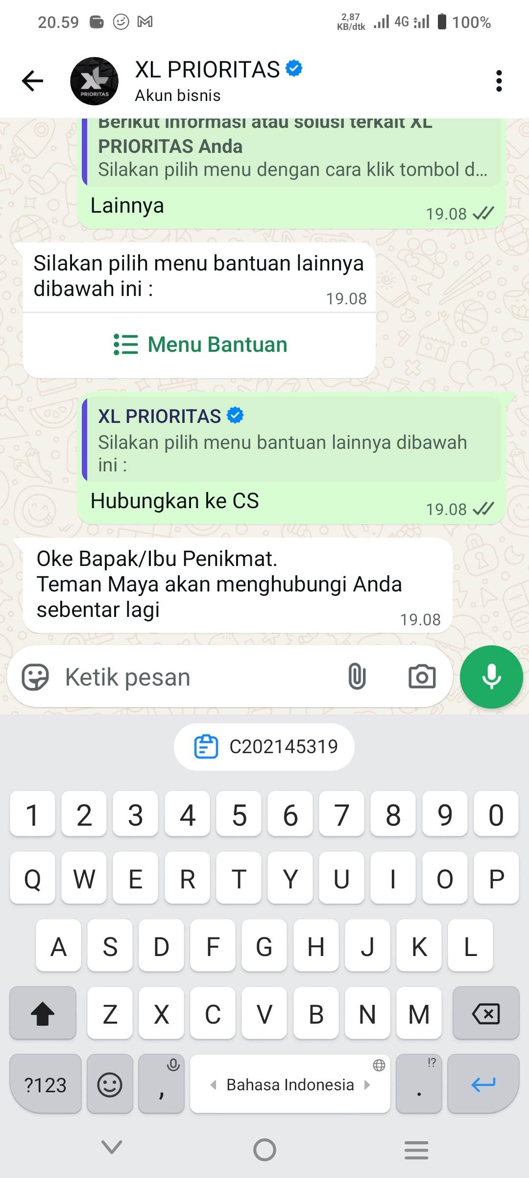 Kemudian saya mencoba menghubungi layanan Customer Service XL melalui live chat di WhatsApp pada tanggal 24 Desember 2025, dengan respons yang terbilang sangat lama.